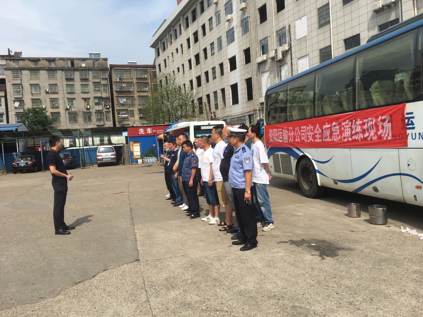 6月16日15點30分,資陽站務(wù)分公司聯(lián)合城區(qū)承包線、益銀巴士公司及資陽區(qū)交通局、資陽區(qū)道路運輸服務(wù)中心在車輛進(jìn)站口下客區(qū)開展安全應(yīng)急演練,共24人參加。在資陽區(qū)道路運輸中心主任楊與強(qiáng)調(diào)本次應(yīng)急演練的注意事項及重要性后,宣布演練開始。