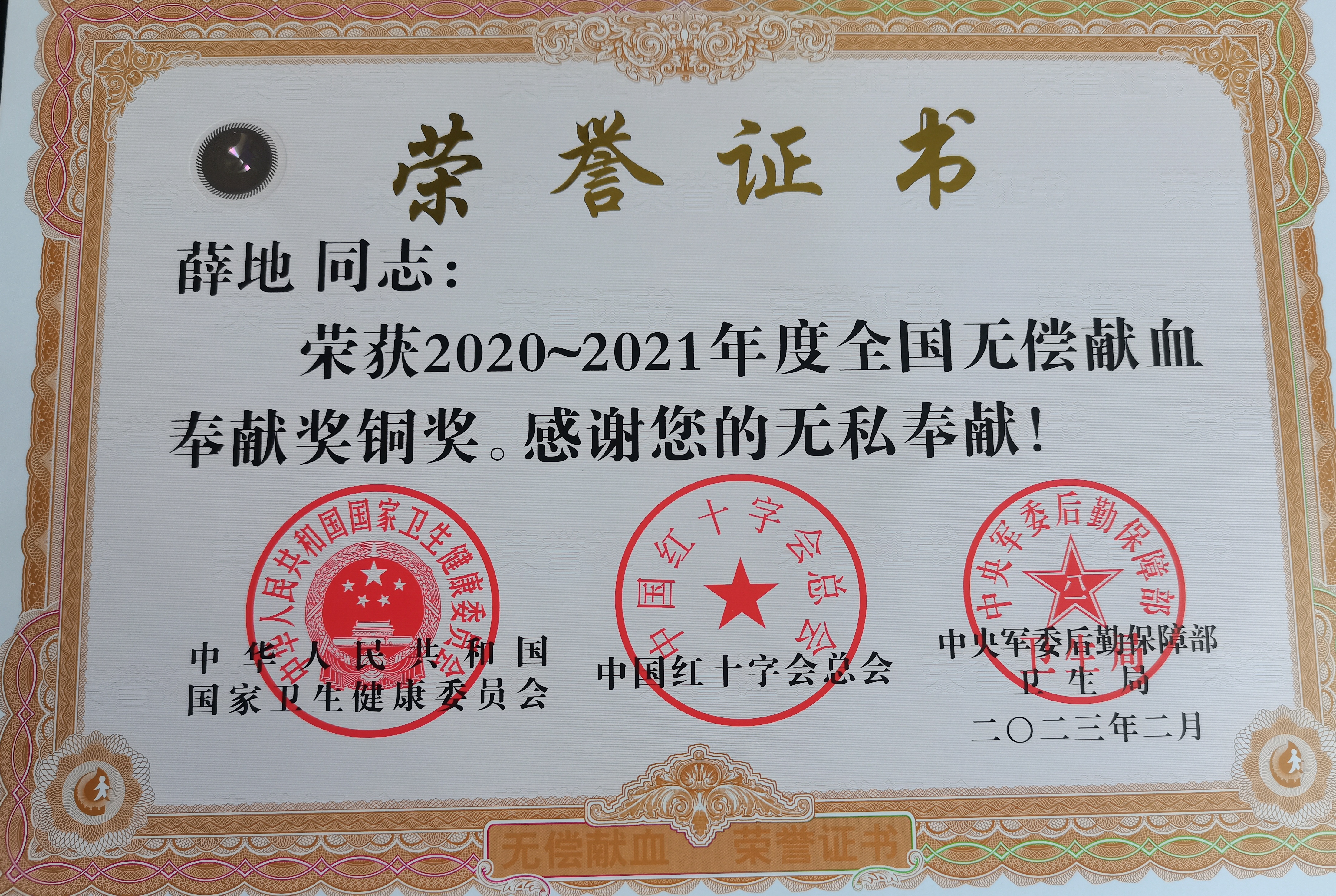 公司員工薛地收到“全國(guó)無(wú)償獻(xiàn)血奉獻(xiàn)銅獎(jiǎng)”證